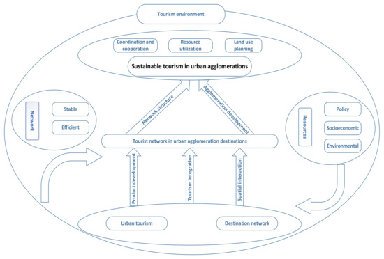 The network structure provides ideas for exploring various issues of cooperation, trust, interdependence, interaction, conflict of interest, leaders and stakeholders in the complex tourism system [82]. Network relationship has become a new course of urban agglomeration tourism research. Figure 7 shows a basic architecture for the research of destination tourism network in urban agglomerations based on the previous analysis, results and discussion. Based on the theory of urban tourism and destination network, the urban agglomeration tourism network is constructed through resource allocation, and the network structure is adjusted to make the urban agglomeration system a more holistic, stable and efficient, as well as realize the sustainable development of regional tourism. Therefore, the evolution process, structural effects, determinants (especially intrinsic factors) and dynamic mechanisms of network structure in the urban agglomerated destination also provide with opportunities for future research.