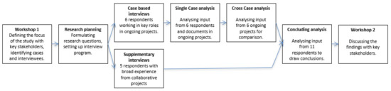 Two different types of interviews were performed, although the same questions were asked: One set of interviews were case based. The questions were answered from the perspective of one particular project—a given context. Six single cases were represented in the interviews. Following this, there were supplementary interviews with key individuals with long experience and knowledge of the questions seen from several perspectives and positions. These interviews add nuances and depth to the analysis. There are five such interviews.