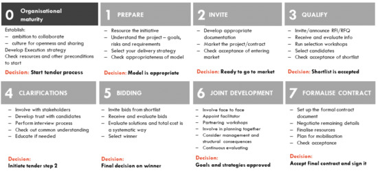 Based on the checklists that resulted from the interviews (see Figure 2), before starting the procurement process, the owner must establish a basis for actually working in a collaborative way. Without it, any attempt will be futile. The execution strategy for the proposed project must be in place and resources and other preconditions to start. The preparation stage is about making the project attractive, but at the same time ensuring the bidders are able to give realistic price bids. The degree of precision and detail in the information at this stage mirrors the level of complexity—understanding this, and its implications, is important for all stakeholders. In complex situations, the initial screening for partners is not a question of finding the bidder with the lowest price but rather the bidders that are able to align with the owner’s goals and ambitions. The best fitted potential partners are shortlisted and invited to deliver initial bids. Depending on the level of complexity, there has to be a phase of dialogue between the client and bidders to establish that the mutual understanding and realistic expectations are established. This becomes distinctly more important when complexity rises. After receiving and evaluating the final bids, the winner is invited to further develop the more detailed plans and conceptual solutions together before finalizing the formal contract. This period is characterized by a high degree of integration between the client and the supplier in very complex cases. The process uses language and definitions that maintain a significant room open for interpretation and handling emerging aspects in the following process of design, production, and delivery. In short—the preparation for a collaborative contract in a highly complex situation is more similar to developing a framework for managing the process together than an upfront identification and allocation of risks between the parties. Complex projects require freedom of interpretation only gained by allowing wide and less precise expressions.