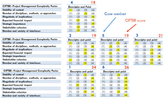 Given that we try to identify consequences rooted in aspects of complexity, it was crucial to have some sort of assessment of the degree of complexity for each of these cases. Complexity was self-assessed by the respondents using the CIFTER framework developed by GAPPS [33]. The CIFTER forms part of a framework for performance-based competency standards for two levels of project managers: Level 1 for “normal” projects and Level 2 for complex projects. The framework is intended to be used to assess threshold competency—demonstration of the ability to do something at a standard considered acceptable in the workplace. In this study, we use the tool, not to assess the competency requirements, but rather the perceived degree of complexity in the situation in which the project manager is working. Figure 3 shows the level of complexity across all case projects. In the CIFTER framework, a score below 11 signifies a simple project, a score of 11–18 is moderately complex, and above 19 is highly complex. In this paper, an additional category was added to signify two extremely complex projects, with scores of 24 or above. None of the cases analyzed in this study were classified as simple. The projects were classified as moderately, highly, or extremely complex. In this research, we explored whether there was a difference in the way the interviewees prepared for collaborative contracts, levels of complexity, and why these differences occur.