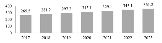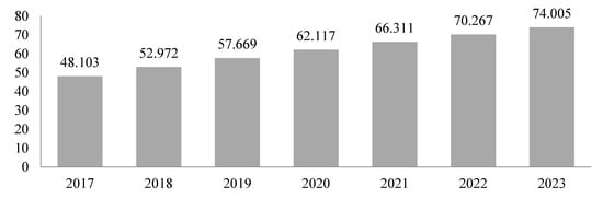 Worldwide, the expansion of P2P platforms has led to the growth of the holiday rental sector, which has been continually expanding and spreading around the globe. Regarding the sector’s revenues, the statistics shown in Figure 1 confirm a pronounced growth of 10.1% from 2017 to 2018, with an estimated annual increase of 7.5% on average. Forecasts suggest that the sector will grow by 28.3% overall from 2019 to 2023.