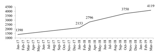 As can be seen in Figure 3, Seville registered an increase of 296.33% in the number of VFTs over the period analysed (i.e., January 2017 to March 2019). As the legislation that regulates VFTs (i.e., Decreto 28 2016) entered into force quite recently, no official records are available with which to analyse the growth of this type of accommodation over a longer period.