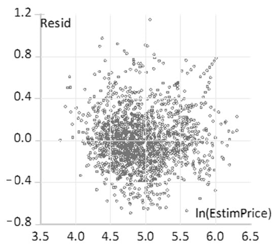 Regarding residual analysis, Figure 5 presents a graph comparing a predicted price versus residuals graph, which does not show trends in variability along with the price range. Additionally, an alternative estimation procedure used White-Hinckley heteroskedasticity consistent standard errors for obtaining the t-statistics associated with the model’s coefficients, but the final results were quite similar, as there were no signs of heteroskedasticity.