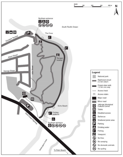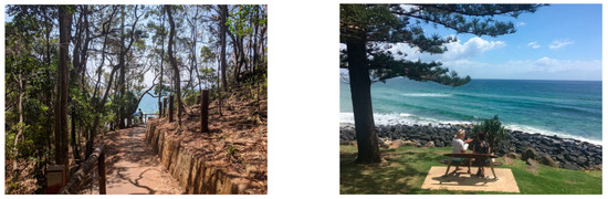 The Burleigh Heads National Park in Australia, rich in natural soundscapes, offered one of the best locations for conducting the current study. The park is the first and only national forest park to combine urban life, ocean cultural heritage, and forest resources in Australia. It covers an area of 3008.8 hectares, and is located in eastern Gold Coast, Queensland (Figure 2). The forest accounts for 60% of the park’s area, creating various natural soundscapes. Moreover, there are 696 types of vascular plants, 867 species of insects, and 181 species of birds in the park, all of which provide a special environment with various natural soundscapes. The largest music sharing platform in Australia, Australian Music Online, launched a sound album named “The natural sounds of Burleigh Heads” in 2018. The album was so popular that 50 million people downloaded it in its first month. This made natural soundscapes in the Burleigh Heads Beach National Park one of the best well-known attractions of the park.