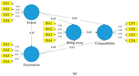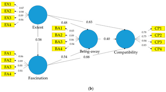 The measurement model used in this study included four constructs: fascination, being-away, extent, and compatibility. The loading of each indicator on its associated latent variable (LV) was higher than 0.75. Generally, the loading should be higher than 0.70 for indicator reliability to be considered acceptable [45]. Hence, the indicators in the measurement model reached a satisfactory indicator reliability level. The composite reliability (CR) coefficient was also used to assess construct reliability and should be higher than 0.70 to establish internal consistency [41]. For each group of data, Table 3 indicates that the CRs of all reflective LVs within the PLS path model were higher than 0.8, which is higher than the required threshold of 0.70. Thus, the measurement model possessed acceptable reliability. To establish convergent validity, the average variance extracted (AVE) of the LVs should be higher than 0.5 [47]. Table 3 shows that all of the AVE values for each group were higher than the critical threshold of 0.50, which supports the convergent validity of the measures.