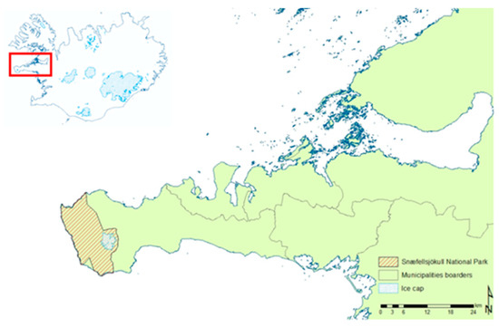 Snæfellsjökull National Park was selected as a case study for the public participation indicator framework development. The national park has grown to be one of Iceland’s most popular tourist attractions. It is located on the westernmost point of Snæfellsnes peninsula, covering some 170 km2 stretching circular around the picturesque stratovolcano Snæfellsjökull with an ice cap covering its top, which holds the area’s highest point of 1446 m a.s.l. [45] (Figure 1). The ice cap presently covers less than 10 km2, and has lost more than 50% of its size in less than a hundred years [46]. Snæfellsjökull National Park was established in 2001 [47]. It is characterized by a volcanic landscape, mainly postglacial basaltic lava originated from Snæfellsjökull. During the Holocene, about twenty eruptions took place, the largest one around 1800 years ago [48]. The lava fields are very porous, resulting in low groundwater level, which affects the vegetation of the area, which is characterized by heathland and moss heath [49]. Both the lava and the vegetation are especially vulnerable to external impacts [50] such as tourism. There are five municipalities located in the Snæfellsnes peninsula, with a population of 3882 on the 1st of January 2018 [51]. Representatives from these five municipalities participated in the case study supporting the framework development.