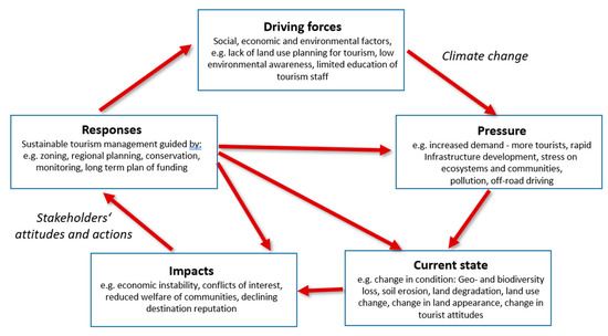 In order to analyze the causality between different environmental impacts and tourism, the DPSIR causal framework of the European Environment Agency (EEA) was applied. DPSIR stands for driving forces, pressure, current state, impacts, and responses. The framework was designed in the late 1990s as a tool for analyzing and understanding the root of environmental problems and thus identifying the appropriate response/action to those problems [66]. In recent years the development of the DPSIR has brought it closer to the concept of sustainability and an analysis of the causality between societal, economic, and environmental factors. Nevertheless, it has been criticized for not covering the dynamics that characterize most systems, as an understanding of the dynamics of systems is one of the main premises of sustainability. Accordingly, DPSIR is closer to being a classification than a model [67]. It has also been criticized for not fully incorporating the attitudes of the different stakeholders, since the attitudes and actions of interested parties are generally connected with the cause or consequence of a certain impact [67].