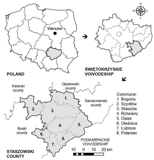 Staszowski County, with an area of 925 km2, was chosen as the study area. It is situated in south-central Poland, in the Świętokrzyskie Voivodeship. The county consists of eight communes, among which Staszów Commune occupies nearly 25% of the area of the county and functions as its seat (Figure 1). Geographically, the area is situated within several geomorphological units, and thus has a diverse terrain. A large part of the county is part of the geographic macroregion of Niecka Nidziańska (Nida Basin), which is a vast depression between Wyżyna Krakowsko-Częstochowska (the Krakow-Częstochowa Upland) and Wyżyna Kielecko-Sandomierska (the Kielce-Sandomierz Upland). The northern part of the county is included in the Wyżyna Kielecka (Kielce Upland) macroregion, with numerous hills intersected by deep ravines [57]. Due to its unique nature assets and numerous historical monuments, tourism is beginning to play an increasing role in the county’s economy [58].