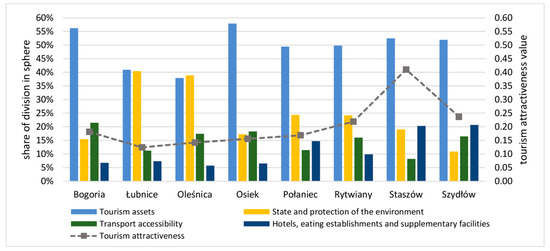 The analyses revealed that communes with high tourism assets have greater tourism attractiveness. The most attractive commune in terms of tourism was Staszów (0.411). The measure of the attractiveness of this commune was markedly higher than for the other communes in the county. The tourism attractiveness of the commune was most influenced by its tourism assets (52.5%), followed by the number of hotels, restaurants, and other service facilities (20.3%). The commune also has the most historical monuments in the county, and the most cultural events take place here. In second place was Szydłów Commune (0.237), followed by Rytwiany Commune (0.219). Both of these communes had a large proportion of tourism assets (52.0% and 49.8%, respectively). The value for Bogoria Commune was somewhat lower (0.181). This is one of the communes with high tourist assets (56.3%), but the number of hotels, restaurants, and other service facilities is a problem. Połaniec Commune (0.169) owes its attractiveness to a large protected area and to cultural events, as well as good transport accessibility. Next in the ranking were the communes of Osiek (0.156) and Oleśnica (0.142). The least attractive commune in the county in terms of tourism was Łubnice Commune (0.124), which despite its tourism assets has poor transport accessibility and inadequate hotel and restaurant facilities (Figure 2).