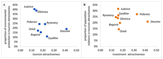 Proportion of environmental protection in tourism attractiveness (A) and of population relations in investment attractiveness (B) for the communes.