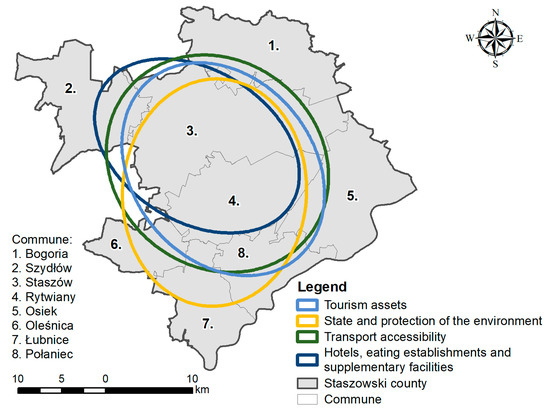 The graphic representation of the standard deviational ellipses for the analysed divisions indicated a directional distribution of the features. The standard deviational ellipse for tourism assets was located in the centre of the county, which indicates that most of the features were located in the communes of Staszów and Rytwiany. The directional distribution was south-eastern, which means an uneven distribution towards the commune of Połaniec. The standard deviational ellipse for environmental protection was shifted southwards, and thus towards the communes of Oleśnica and Łubnica. In the case of transport accessibility, the location and shape of the ellipse points to the central communes in the county, and thus to Staszów (the county seat) and the adjacent communes. The standard deviational ellipse for hotels, eating establishments and other conveniences had the smallest area, and thus the concentration of these facilities was highest relative to the other divisions. The location of the ellipse and the directional distribution towards the southeast indicates that these facilities were concentrated in three communes: Staszów, Szydłów and Rytwiany (Figure 4).