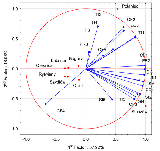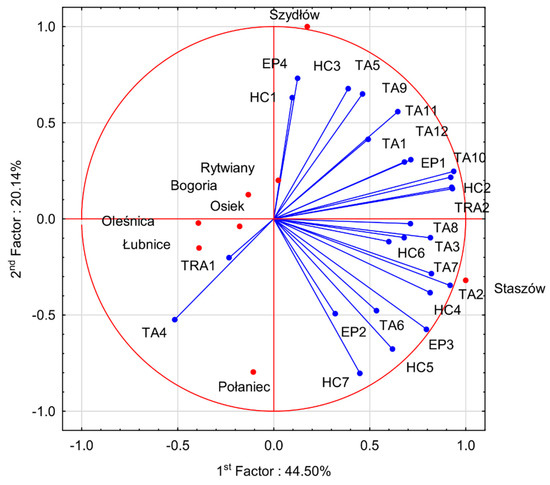 The graphic presentation of the data pertaining to tourism attractiveness using principal component analysis for all communes together explained a large portion of the variation in the data –67.95% of the variance of primary variables. The analysis showed positive relationships between most of the features in the division of tourism assets and hotels, eating establishments and supplementary facilities. Negative relationships were observed for individual features, e.g., the area of wasteland and the number of boarding houses. Staszów Commune had the highest values among all the communes for features related to tourism assets (Figure 5).