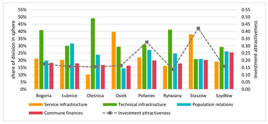 In terms of attractiveness for investors, the value for the synthetic measure was nearly twice as high for two communes, Staszów (0.422) and Połaniec (0.326), as for the remaining communes. The high investment attractiveness in Staszów Commune was most influenced by its well-developed service infrastructure (38.0%), and in Połaniec Commune by its technical infrastructure (30.9%) and population relations (27.2%). The other communes of Staszowski County had similar levels of investment potential, with values ranging from 0.137 (Rytwiany) to 0.175 (Bogoria). The communes of Bogoria, Łubnica and Szydłów had similar proportions of service infrastructure (on average 20.2%). Most of the communes had similar proportions of population relations in their investment potential (on average 18.2%). Only Szydłów Commune had a higher proportion −25.5% (Figure 6).