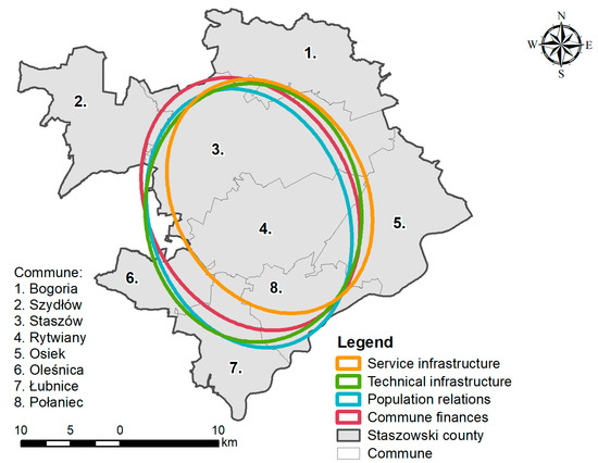 The standard deviational ellipses for the analysed divisions indicated a directional distribution of the features, but less so than in the case of the divisions pertaining to tourism attractiveness. The standard deviational ellipse for service infrastructure was located in the centre of the county, and its concentration was the highest of all ellipses. The directional distribution of the ellipses pointed to the communes of Staszów and Osiek. The standard deviational ellipse for technical infrastructure was also located in the centre of the county, but its area indicates greater dispersion of the features. In the case of population relations, the area of the standard deviational ellipse indicated similar dispersion of features as in the case of technical infrastructure. The ellipse was shifted towards the communes of Oleśnica and Łubnica. The directional distribution of the standard deviational ellipses for commune finances was south-eastern, which indicates uneven dispersion towards Połaniec Commune (Figure 7).