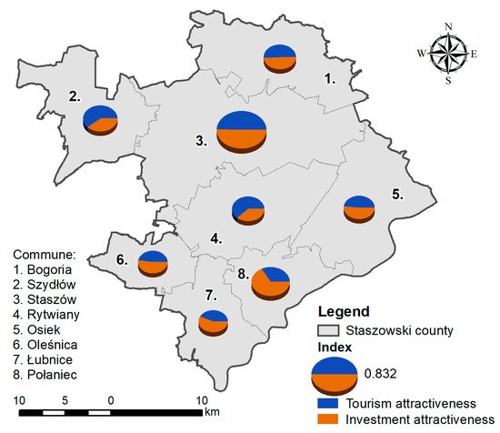 Based on the valorisation of individual communes, a typology of the study area was drawn up, with particular focus on two indicators of sustainable development: environmental protection and population relations in Staszowski County. The proportion of environmental protection in the tourism attractiveness of each commune and that of population relations in the attractiveness of each commune for investors were compared. Next, four groups of communes were identified according to the intensification of environmental protection measures, and four groups were identified according to the intensification of measures associated with population relations representing sustainable development in tourism. For investment attractiveness, these were communes with (1) tourism assets higher than the county average and an environmental protection index higher than the county average; (2) tourism assets lower than the county average but an environmental protection index higher than the county average; (3) tourism assets higher than the county average but an environmental protection index lower than the county average; and (4) tourism assets and an environmental protection index both lower than the county average. An analogous division into four groups of communes was made for investment attractiveness, except that in this case the indicator of sustainable development was population relations. The methodology assumed that wealthier and stronger communes, i.e., those with high tourism attractiveness and attractiveness for investors, should be supported.