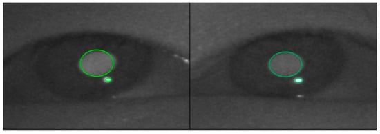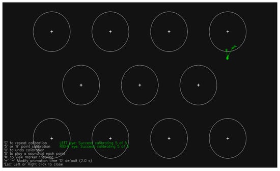 The eye-tracker device used was the GP3 HD Eye Tracker, from Gagepoint. The device is a fixed eye-tracker capable of measuring eyeball movement at 150 Hz per second. After the eye-tracker was installed on a 24-inch monitor, the distance between the participant and the monitor was set at 40–60 cm. Before the experiment, a calibration task was performed to properly fix the eyes of the participants to the camera of the eye tracker (Figure 1). Calibration is to adjust the distance and height between the eye and the eye-tracker so that the eye-tracker recognizes the eye of the participant. Figure 1 shows that the eye-tracker recognizes the participant’s pupils and appears in green. The next step in viewpoint adjustment is to test whether the eye tracker properly recognizes the participant’s pupil. The test is a method of checking whether the green cursor moves exactly to the participant’s viewing position by looking at the screen with 11 circles drawn on the monitor and moving their gaze (Figure 2). If the cursor moves differently from the participant’s gaze, the viewpoint is adjusted again and tested.