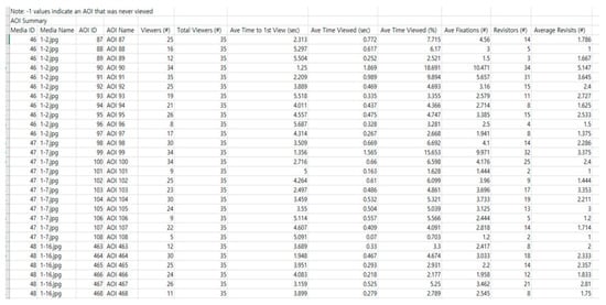 The data obtained from the experiment was exported in a CSV file format and checked whether it is properly measured. Since the device used in the experiment measures 150 hz per second, about 1500 gaze data were secured for 10 s per photo. However, as a result of the review, there were participants whose data were collected less than 1500. As a result of checking the recorded eye-tracking gaze video, there was a case where the participant’s posture was excessively disturbed and changed from the initial viewpoint adjustment and the eye-tracker missed the participant’s pupil due to the nature of the fixed eye-tracker. In addition, when wearing thick plastic glasses or earrings, the eye tracker recognized the part as a pupil due to the reflection and was measured incorrectly. 33 of the 41 participants’ data of the experiment were finally used in the analysis, except for those samples whose eyes were incorrectly measured or did not respond to further surveys.