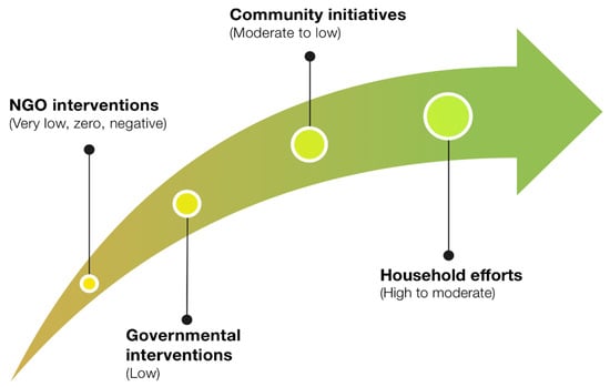 - Avoidance of maladaptation: In addressing large-scale coastal problems like salinity intrusion, cyclones, and storm surges in order to support shrimp and non-shrimp livelihoods, planned interventions from the Bangladesh Government is required. However, policy makers, local-level implanting authorities, and members of society should be attentive about maladaptation, in which adaptation programs benefit one group or sector of the society at the expense of increasing the risk to another group or sector (see, Barnett and O’Neill [78]).