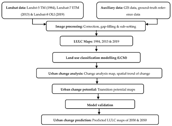 The methodology involves using hybrid GIS and CA-Markov for assessing and examining LULC modeling and predicting transport system infrastructure demand in Kano metropolis. Before implementing algorithms for LULC change detection, a series of pre-processing measures were carried out for Landsat images, including atmospheric correction, cloud and atmosphere recognition, and composite fusion metric techniques [32,33]. The methodological algorithm of the hybrid model is shown Figure 1.