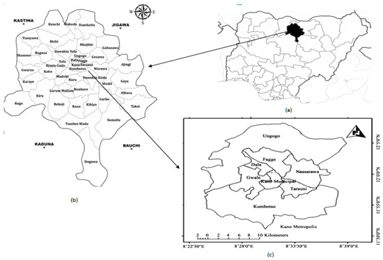 Map of Kano State showing the study area: (a) Nigeria (b) Kano State (c) Kano city.