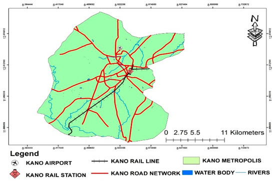 Kano city is an urban conurbation of eight (8) Local Government Areas (LGAs) (Dala, Fagge, Gwale, Kano Municipal, Nassarawa, Tarauni, Ungogo and Kumbotso), located between latitudes 11°25′ N to 12°47′ N and longitude 8°22′ E to 8°39′ E on 472 m above sea level in the Sahel desert. It is the commerce nerve center of the northern country due to its long flourishing marketing (and dominant economic) activities. Nevertheless, agriculture is a second means of employment on the savannah vegetation with Jakara and Challawa rivers being the main water bodies draining the city catchment area [34]. Figure 2 shows the location map of the city metropolitan study area and Figure 3 is the digitized map of major transport infrastructure.