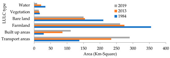 The LULC transition retrospective trend is shown in Figure 4 by the spatial-temporal shifts from 1984 to 2019. Table 2 provides remote-sensing data on Kano land-use and spatial patterns for 1984, 2013 and 2019 respectively. During 1984 to 2013, urbanization had gathered momentum as evident in transport and built-up areas which recorded noticeable spatial growth of 97 km2 (70.8%) and 57 km2 (196.6%), respectively. In the same 29-year period, other land use classes had suffered spatial losses and receded in sizes—farmland (−81 km2), bare land (−56 km2), vegetation (−1.5 km2) and water (−12.9 km2) respectively. In these four land-use classes, the bulk of the spatial reductions is mainly attributed to significant gains in both transport and built-up areas.