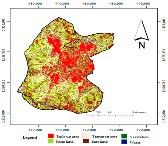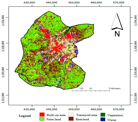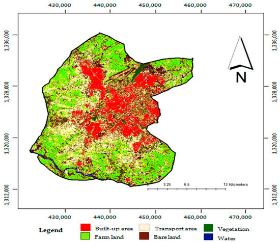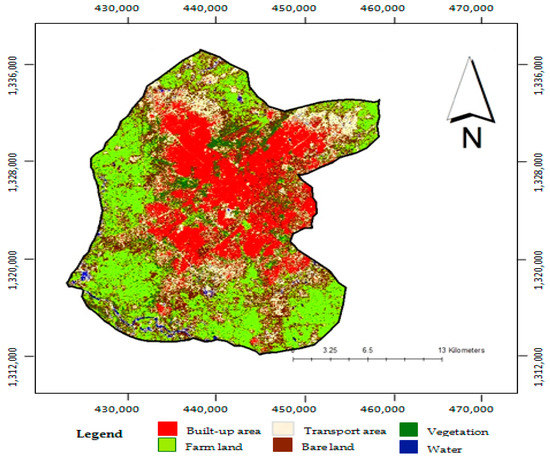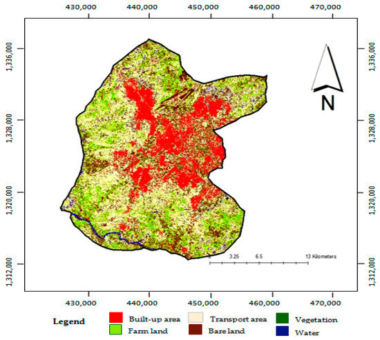The algorithm also assumes that the data is normally distributed and predicts a high probability that a certain pixel is placed into the right class. Additionally, it has a high probability of quantifying minority groups within the appropriate pixel spectral class without being mis-classified into the larger LULC classes during model training. Landsat image classification was carried out using ARC-GIS 10.7 based on supervised classification of maximum likelihood where each pixel was classified into one of the following land use classes: transport infrastructure, built-up areas, farmland, vegetation, bare land and water. The distribution maps were classified into the six LULC categories including its spatial extent, based on the characteristics displayed directly in remote-sensing images (e.g., size, form, texture and hue etc.). Post-classification change detection was implemented in IDRISI Selva 17 pro version software, which requires two classified images to be compared with details on pixel-based transition [45].