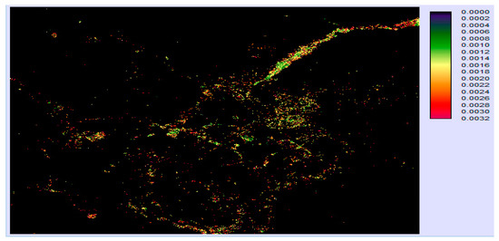 The model is used in the forecasting of future growth of the land dynamics, and is called Markov land-use prediction (MLP) after calibration and validation. The steps include defining, standardizing and aggregating defined criteria in the decision wizard module of IDRISI Selva 17.0 to area maps for LULC transition changes. To predict future urban land-use distribution at discrete time scales, we substitute inputs of initial state matrix areas (Equation (7)) and initial state transition matrix (Table 4) into a Markov simulation model in Equation (6). Transition distribution maps in Figure 8 and Figure 9 are the outcomes of the Markov chain prediction of urban landscape evolving trends in the Kano metropolitan environment for 2030 and 2050, respectively.