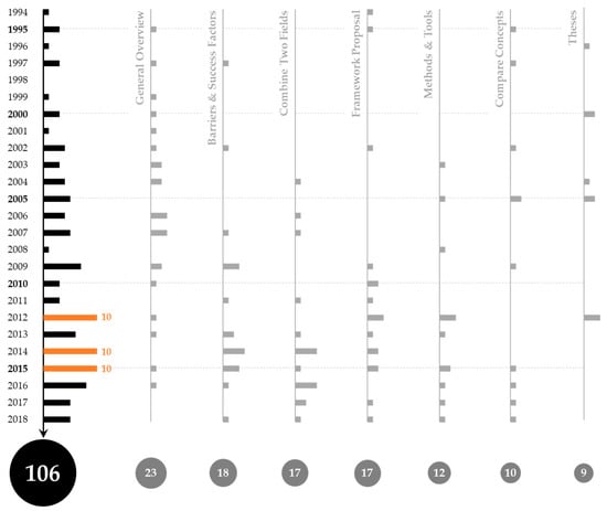 The 106 review articles were published between 1994 and 2018. Earlier relevant articles may exist, but the literature retrieval process previously described did not identify any. Articles published later than 2018 may have been missed due to the timing of the research process for this review article. The literature retrieval stage was concluded at some point, in order to move on to the analysis, conceptualization, and writing stage.