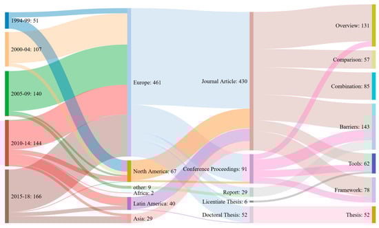Sankey diagram on the origin of 608 statements extracted from 106 review articles on ecodesign. From left to right: publication year of the article from which the statements were extracted; location of the institution the primary author of the publication was affiliated at the time; type of publication the statement appears in; primary purpose of the publication the statement appears in. The Sankey diagram was created using the free online tool SankeyMATIC by Steve Bogart (www.sankeymatic.com).
