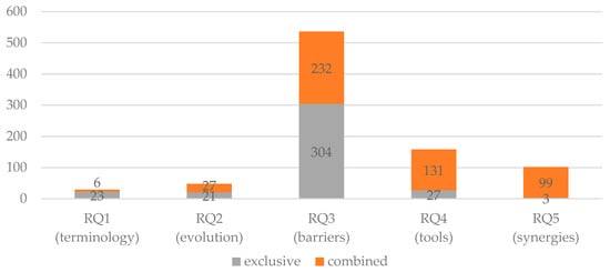 Analysis of 608 statements extracted from 106 review articles on ecodesign, categorizing the statements by the research question (RQ) they address. The RQs are stated in full in the introductory section of this article. “Exclusive” describes statements which only relate to one of the RQs, whereas “combined” refers to a statement that touches on multiple RQs. Because of this overlap, the sum of all values adds up to more than 608 (the number of statements in total).