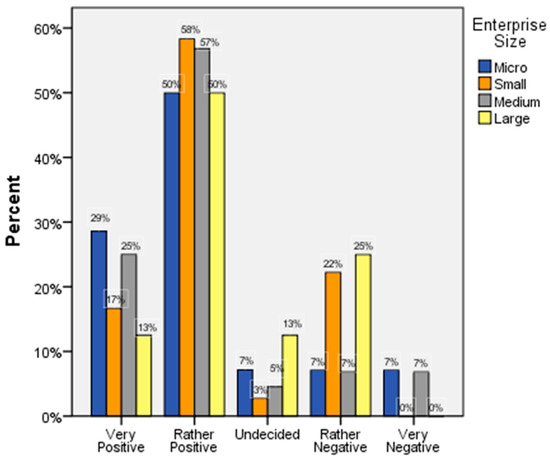Interestingly, the opinions presented in Table 2 do not seem to have a significant impact on the respondents’ overall evaluation of the effect the labels had on their businesses. As can be seen from Figure 2, the majority of businesses of different sizes evaluated the overall effect of the labels as positive. The most satisfied were the respondents from the micro (78.6%), small (75.0%), and medium (81.8%) businesses. Also, Figure 2 shows that the respondents from the small (22.2%) and large (25.0%) businesses expressed that their evaluation may be rather negative; this illustrates that large enterprises may benefit less from those labels, as they have already build strong brands [32].
