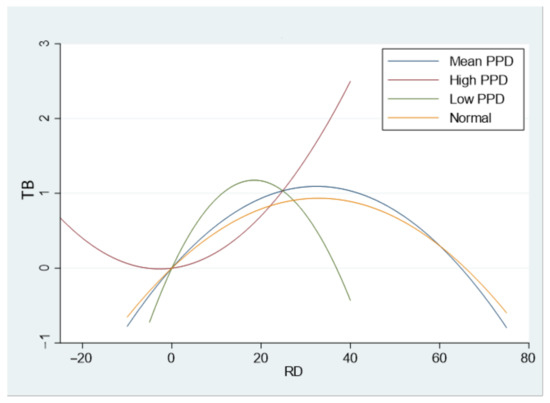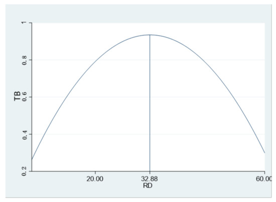 The square term of R&D intensity (RD) is added to the model (3), and the increment R2 shows that model (3) is more explanatory than the model (2). We use the more stringent inverted U inspection standard to verify the following: first, the coefficient of the first term is significantly positive (0.0569) and the coefficient of the square term is significantly negative (−0.000865). Second, the slope of the curve is significantly positive at the left end of the RD value range (0.06967), the right end is significantly negative (−0.056). Finally, the inflection point of the curve (32.884) is within the range of RD [0.55–43.06]. Thus, this study observed a complete inverted U-shaped curve. It shows that R&D intensity (RD) and enterprise performance (TB) do not show a simple linear increasing relationship, but a typical inverted U-shaped relationship (as shown in Figure 1). This result validates the hypothesis 1 in this study.