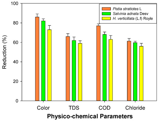 The obtained results indicated that a removal efficiency higher than 50% was achieved for color, TDS, COD, and chloride after 48 h of treatment by the three plants. Among the three plants, Pistia stratiotes L showed the best performance for the removal of color, chloride, TDS, and COD, whereas H. verticillata (L.f) Royle exhibited the lowest removal efficiency (Figure 2). The TDS, COD and chloride level of Pistia stratiotes L-treated dyeing effluent were found to be 4290 mg/L, 1848 mg/L, and 1250.5 mg/L, respectively. The values of toxic metals, Pb, and Cr of treated effluent and plant samples used for treatment were found to be below the detectable level (Table 2). Among the four environmental factors investigated during the phytoremediation, color was removed more efficiently than other factors such as TDS, COD, and chloride. A color removal efficiency of 73–86% was achieved after 48 hr of treatment by the three plants (Figure 3). Chloride seemed to be removed less than other parameters. Only 56–61.33% of chloride was removed at the end of incubation of all plants. The pH of the effluent was neutralized before subjecting it to phytoremediation. After treatment, there was no significant change in pH observed. Similarly, the maximum decolorization potential of Eichhornia sp. in textile effluent was recorded by Anjana and Thanga [27]. P. stratiotes L was reported as an effective hyperaccumulator and could uptake the contaminants as well as nutrients through rhizofiltration mechanism and was utilized for growth, which resulted in a high biomass production [28]. In this study, the accumulation of dye stuffs was observed in the roots and leaves of P. stratiotes L and S. adnata Desv plants (Figure 4). Anuradha et al. [29] stated that plant peroxidase is involved in the deterioration of textile dye substances. Ugya et al. [30] have reported the TDS- and TSS-reducing efficiency of P. stratiotes form textile wastewater. Ng et al. [31] achieved 39% of COD and 95% of phosphate removal from palm oil mill effluent using Salvinia molesta. Likewise, Chandanshive et al. [10] reported the Rubine GFL dye decolourizing efficiency of Salvinia molesta D.C Mitch through the activation of oxidoreductase (azo-reductase, lacase, and catalase) and peroxidase enzymes. The phenolic compounds of plants were chiefly involved in the antioxidant activity during physiological stress that occurs in plants [32,33]. Xue and Yan [34] proved the arsenic-removal capability of H. verticillata (L.f) Royle through the phytoaccumulation and phytofiltration mechanism, by immobilizing arsenic in plant shoots. In the same pathway, P. stratiotes L might eliminate the pollutants from the dyeing effluent. Fonkou et al. [35] studied the efficiency of P. stratiotes L to remove suspended solids, sulfates, phosphates, and turbidity from the wastewater. Al-Baldawi et al. [36] reported the methyl orange dye removal efficiency of Salvinia molesta and its FTIR test also confirmed the phytotransformation of methyl orange.