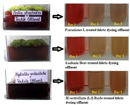 Pistia stratiotes L (family: Araceae; common name: water lettuce), Salvinia adnata Desv (family: Salviniaceae; common name: water fern), and Hydrilla verticillata (L.f) Royle (family: Hydrocharitaceae; common name: water thyme) (Figure 1) were collected from freshwater without the influence of dyeing effluent. The collected plants were authenticated by the botanical survey of India, Southern Regional Centre (TNAU campus, Lawley Road, Coimbatore, Tamilnadu, India) (Ref. No.: BSI/SRC/5/23/2017/Tech.2837).