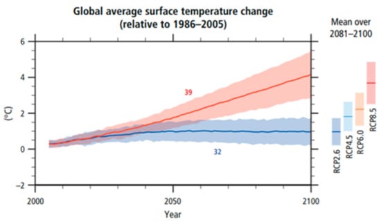 Figure 1 shows the global average surface temperature change from 2006 to 2100 under various representative concentration pathways (RCPs) including a stringent mitigation scenario (RCP2.6), two intermediate scenarios (RCP4.5 and RCP6.0), and one scenario with very high GHG emissions (RCP8.5) [10].