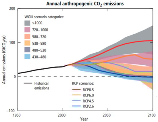 Annual carbon dioxide (CO2) emissions in the representative concentration pathways (RCPs) and the associated scenario categories [10].