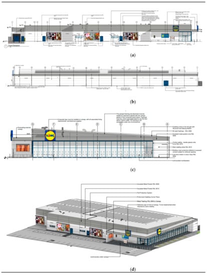 The TAS modelling contains AutoCAD architectural building drawings of the LIDL baseline supermarket store. The drawings consist of front, rear, and gable elevations. Along with it, it has the floor and roof plans to make it as accurate as possible. Figure 3a–d show the architectural drawings and their respective specification details.