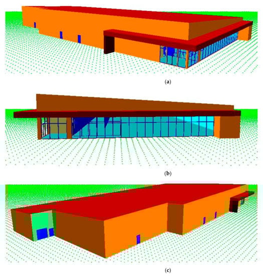 The analysis and model of baseline LIDL model supermarket based in London UK is presented in Figure 4a–c. These represent the results of the simulation modelling covering different sides of the building geometry.