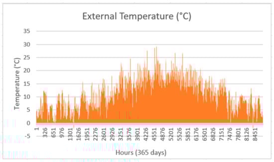 An evaluation of the variation of temperature and load analysis is presented in Figure 12 and Figure 13. The future predicted climate variation of the 2080s clearly shows a high upsurge in the temperature as compared to the current weather data. The comparison of the external temperature for the current weather data and the worst-case scenario of the 2080s high (90th) percentile shows that the external temperature ranges from 6 °C to 30.7 °C with relatively few periods going above the 30 °C mark for the current weather data; however, for the worst-case scenario, the external temperature ranges from 9.4 °C to 36.6 °C with 55 occurrences of above the 30 °C mark for the specified period of analysis, respectively.