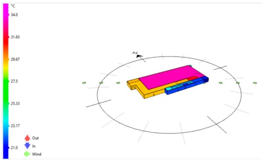 Another important parameter to compare is the external temperature of the building that will vary depending on the weather conditions. Figure 5 shows the minimum and maximum external temperatures as −3.2 °C and 30.7 °C, occurring on March 2 and July 14, respectively. All the information given in Figure 5 and Figure 6 is used for further statistical analysis. Figure 6 shows a three dimensional visualization of the building’s resultant temperature at peak external temperature (30.7 °C) on 14 July.