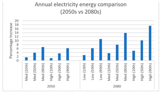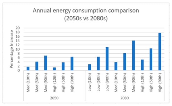 Table 6 and Table 7 show the annual energy consumption for current and future climatic projections for the 2050s period, for medium and high emission scenarios, and for 10th, 50th, and 90th percentiles, and similarly for the 2080s period, they provide the energy consumption for the three emission scenarios of low, medium and high, for the 10th, 50th, and 90th percentile. All the predicted scenarios show that there is a constant gradual increase in energy consumption over the years, irrespective of any scenario or percentile chosen.