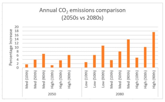 Annual CO2 emissions comparison (2050s vs 2080s).