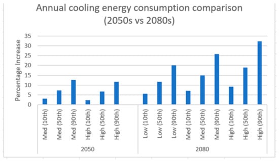 Annual cooling energy consumption comparison (2050s vs. 2080s).