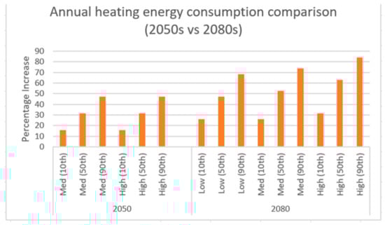 Annual heating energy consumption comparison (2050s vs. 2080s).