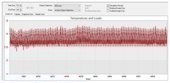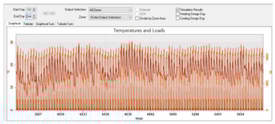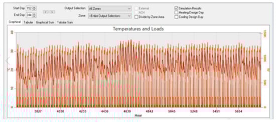 An evaluation of the variation of temperature and load analysis is presented in Figure 15 and Figure 16. The future predicted climate variation of the 2080s clearly shows a high upsurge in the temperature as compared to the current weather data. The comparison of the temperature load analysis for the current weather data and the worst-case scenario of the 2080s high (90th) percentile shows that dry bulb temperature ranges from 12.0 °C to 34.44 °C with relatively few periods going above the 30 °C mark for the current weather data; however, for the worst-case scenario, the external temperature ranges from 12.0 °C to 36.62 °C with the time periods going above the 30 °C mark over 1.5 times more for the specified period of analysis, respectively.