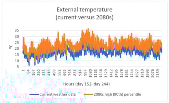 External temperature comparison: the current weather data versus the 2080s scenario (1 June–31 August).