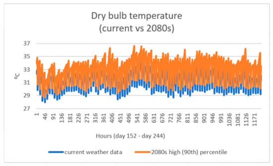 Dry bulb temperature comparison: the current weather data versus the 2080s scenario (1 June–31 August).