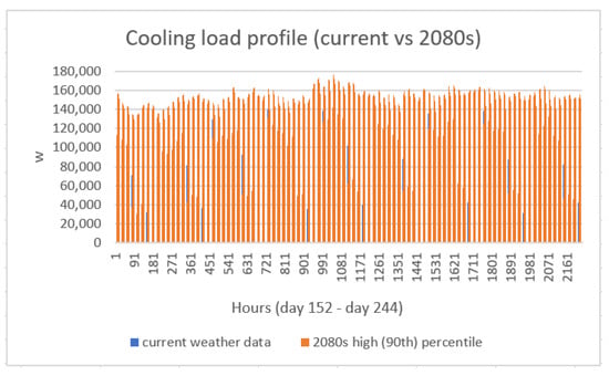 Cooling load profile comparison: the current weather data versus the 2080s scenario (1 June–31 August).