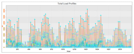 The comparison of the total load profile analysis for the current weather data and the worst-case scenario of the 2080s high (90th) percentile shows that the heating load profile ranges from 0 W to 6268.19 W with relatively few periods going above the 5000 W mark for the 2080s high (90th) percentile weather data; however, for the current weather data, the heating load profile ranges from 0 W to 8569.84 W with the time periods going above the 5000 W mark over 11 times more for the specified period of analysis, respectively.